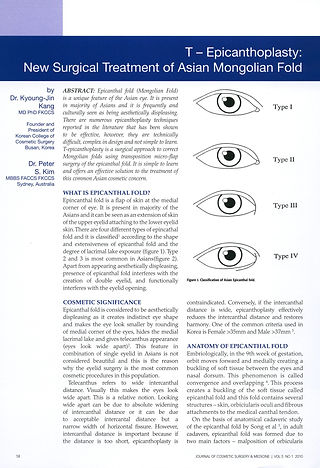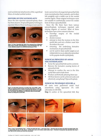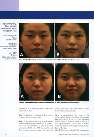 姜景进博士,内眦赘皮(內雙眼皮)的T型手术法: 亚洲蒙古折的新手术治疗法, 美容手术和医学杂志 (JCSM)2010; 5(1): 58-61页。 (ISSN 1834-3562)